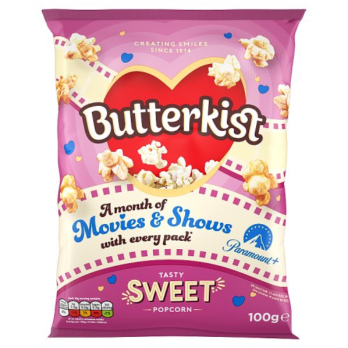 A month of Movies & Shows with every pack* Paramount+ UK (excl IoM, CI and ROI), 18+. See reverse of pack for T&Cs. Terms & Conditions: *UK excluding IoM, CI and ROI, 18+. Promotion runs 00:01 02/02/26 to 23:59 25/05/26. One claim per household irrespective of the number of packs purchased. Purchase required, retain receipt. Must be a new Paramount+ customer to redeem offer. Purchase any participating pack of Butterkist Popcorn, visit butterkist.co.uk/promotion, enter your details and upload a receipt to claim your code. Code must be claimed by 25/05/26 Code provides for one month of Paramount+ on us. Standard Monthly Plan required. After the first month, plan auto-renews at the then-current full price until cancelled. As at the date of print, price of a Standard Monthly Plan is £7.99/month. Code must be redeemed by 25/06/26. For additional material information about Paramount+ visit pplus.legal/materialinfo. To sign up for Paramount+, a compatible device, internet access, valid e-mail address & payment method is required. Visit butterkist.co.uk/promotion for full T&Cs. Promoter: KP Snacks Ltd, Fifth Floor, The Urban Building, 3-9 Albert Street, Slough, SL1 2BE. PARAMOUNTPLUS.COM/GB/
