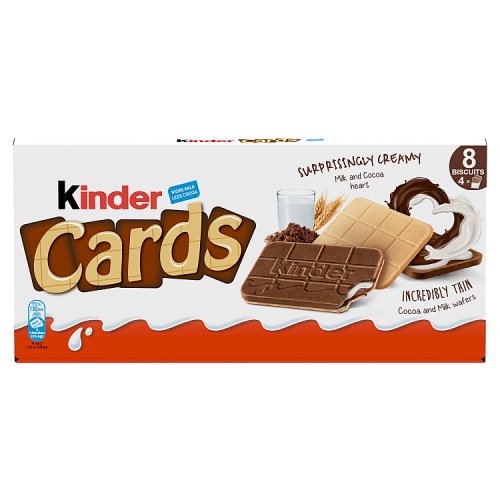 Kinder Cards, discover the unique Kinder biscuit with milk and cocoa. The cocoa & milk wafers are so thin that you immediately enjoy the surprisingly creamy milk & cocoa filling. The wafers enclose and protect the creamy heart to guarantee the highest convenience, without making your child's hands dirty. Kinder Cards is individually wrapped, to guarantee convenience and crispiness. It is ideal for an on the go break for your child. Kinder guarantees the quality of its carefully selected ingredients.