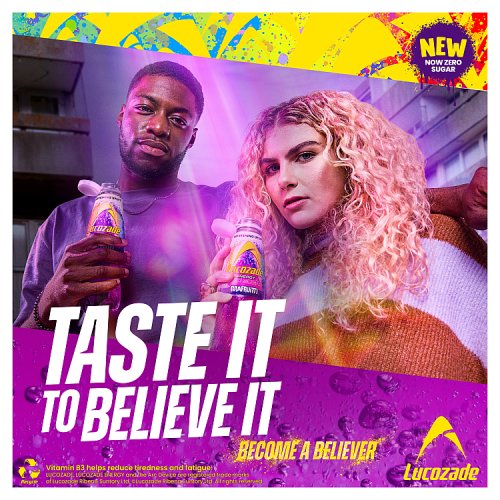 BACK FOR THE BELIEVERS! We listened, and we delivered - the legendary Lucozade Energy Grafruitti flavour returns. FUELLED BY NOSTALGIA - made for the fans who never stopped believing! ICONIC GRAFRUITTI TASTE - A bold flavourful hit with that unmistakable Lucozade edge: sharp, refreshing and seriously delicious! ZERO SUGAR, ZERO COMPROMISE - The same unforgettable flavour, this time with zero sugar. Best enjoyed cold. With Vitamin B3 to help reduce tiredness and fatigue, Lucozade Energy Zero Sugar supports your everyday energy to help get you through even your busiest days! As well as tasting great, we also try to do our bit for a sustainable future! Lucozade Energy bottles feature a half sleeve design, helping to save plastic and improve recyclability. Once opened store in the fridge and drink within 4 days. Enjoy as part of a balanced diet and an active lifestyle. Contains 2 servings.