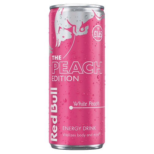 Vitalizes body and mind®. The same benefits of the original Red Bull Energy Drink with the taste of White Peach. Giving wiiings to people and ideas since 1987. Red Bull gives you wiiings Stay alert Red Bull Peach Edition contains caffeine that helps to improve concentration and increase alertness. Reduce fatigue Red Bull Peach Edition contains B-group vitamins (niacin, pantothenic acid, B6, B12), which contribute to the reduction of tiredness and fatigue. Kickstart your day Red Bull Peach Edition contains real sugar, a fast-absorbing form of carbohydrate involved in a wide range of biological processes and an energy source for the brain and muscles. Balance your body Red Bull Peach Edition contains taurine, an amino acid that occurs naturally in the human body and is involved in a range of processes including regulation of water/electrolyte balance at the cellular level. Water Water is the main ingredient of Red Bull. Dedication to its quality contributes to the iconic taste in every sip. When to drink Red Bull Energy Drink gives you wiiings whenever you need them – at work, during sports, while studying, gaming, going out with friends, enjoying a festival, or being on the go. Red Bull is a great choice for an active lifestyle.