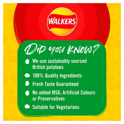 - Multipack of Walkers Salt & Vinegar crisps - Made with 100% Great British Potatoes - Fresh taste guaranteed - Perfect crisps for lunch and snacking - Multipack contains 6 bags of crisps - Suitable for vegetarians - No added MSG, Artificial Colours or Preservatives